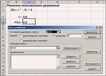 1. в поле Установить целевую ячейку ввести адрес ячейки, содержащей формулу для вычисления значений оптимизируемой функции, в нашем примере целевая ячейка - это С4, а формула в ней имеет вид: = C3^2 - 5*C3 + 6;