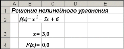 В ячейку С3 (рис. 10) введем формулу для вычисления значения функции, стоящей в уравнении слева от знака равенства. В качестве аргумента используем ссылку на ячейку С2, т.е. =С2^2-5*C2+6.