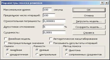 Опции, управляющие работой Поиска решения, задаваемые в окне Параметры (окно появляется, если нажать на кнопку Параметры окна Поиск решения), следующие (рис. 14):