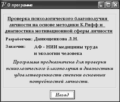 С помощью разработанной программы осуществляется обработка методов тестирования. Психологическое тестирование проводится в режиме диалога тестируемого с компьютером. В качестве методов сбора данных выступают компьютерные версии психодиагностических методик «Шкалы психологического благополучия», предложенная К. Рифф и «Диагностика мотивационной сферы», разработанная на основе теории иерархии потребностей А. Маслоу.