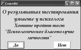 По окончании теста будет выведено окно-сообщение (Рисунок 22). При нажатии на кнопку «Да» на экран выводится форма «Сравнение утверждений», если на кнопку «Нет», произойдет выход из программы.