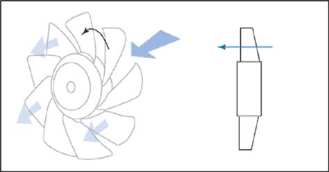 Диагональные вентиляторы - Диагональные вентиляторы являются смешением радиальных и осевых вентиляторов, радиальная крыльчатка вызывает увеличение статического давления в связи с центробежной силой, действующей в радиальном направлении. У осевой крыльчатки не возникает эквивалентного давления, поскольку воздушный поток является нормально осевым.