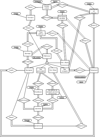 На территории предприятия находится несколько цехов по переработке древесины, за каждым цехом закреплена сушильная камера; также имеется склад готовой продукции. Цеха пронумерованы. В каждом цехе работает бригада, (в цехе их может быть несколько), которая осуществляет распиловку древесины и её сдачу на склад продукции. Бригадир получает лес от начальника базы. Приём готовой продукции ведёт кладовщик.