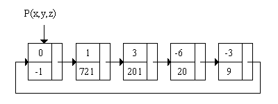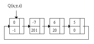 Полином представляется кольцевым списком. Каждое звено списка соответствует моному с ненулевым коэффициентом. Звено состоит из трех полей и включает поле для хранения коэффициента, поле для хранения свернутой степени и поле для хранения указателя на звено следующего по порядку монома. Следующим после последнего звена является