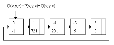 Структуры хранения полиномов P(x,y,z), Q(x,y,z) и их суммы показаны на рисунке.
