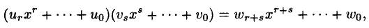 где коэффициенты U1, ..., Un, U0 — элементы некоторой алгебраической системы S, а переменная х может рассматриваться как формальный символ без определенного значения. Будем полагать, что алгебраическая система S представляет собой коммутативное кольцо с единицей. Это означает, что S допускает операции сложения, вычитания и умножения, удовлетворяющие обычным свойствам: сложение и умножение являются ассоциативными и коммутативными бинарными операциями, определенными на S, причем умножение дистрибутивно по отношению к сложению. Существует также единичный элемент по сложению 0 и единичный элемент по умножению 1, такие, что а + 0 = а и а • 1 = а для всех а из S. Вычитание является обратной по отношению к сложению операцией, но о возможности деления как об операции, обратной по отношению к умножению, ничего не предполагается.