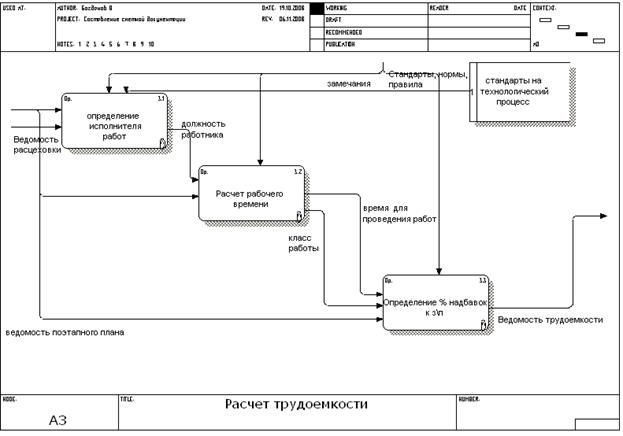 Работник отдела заносит в базу данных полную информацию об объекте (план разработки, названия цехов, участвующих в разработке, профессии работников, условия труда, трудоемкость и тд.). Система формирует сводную ведомость в которой отражены сведения об этапах разработки.
