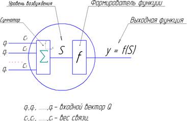 Взвешенные веса сигналов c i q i поступают на сумматор, на его выходе появляется уровень возбуждения S :