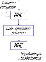 Сигнал состояния наблюдаемого объекта (ситуация) поступает на вход ИНС , которая принимает решение о вмешательстве в процесс. ИНС в данном случае распознает образы.