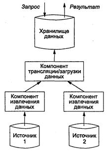 Интегрирующая архитектура хранилища данных предусматривает извлечение (выгрузку) информации из нескольких источников и сочетание ее в рамках глобальной схемы хранилища, которое воспринимается пользователем как традиционная база данных.