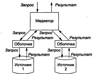 Как видно из рис.2.2, медиатор посылает запросы каждой из оболочек, а те в свою очередь адресуют их соответствующим источникам. (В определенных случаях медиатор способен направлять какой-либо оболочке целую серию запросов, а к некоторым другим оболочкам не обращаться вовсе.) Оболочка передает медиатору полученный ею итог обработки запроса, а медиатор, осуществляя объединение и трансляцию данных, возвращенных оболочками, формирует окончательный результат и отсылает его пользователю