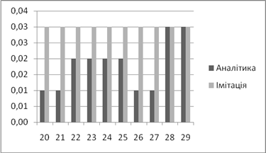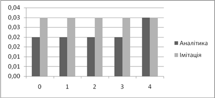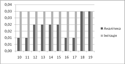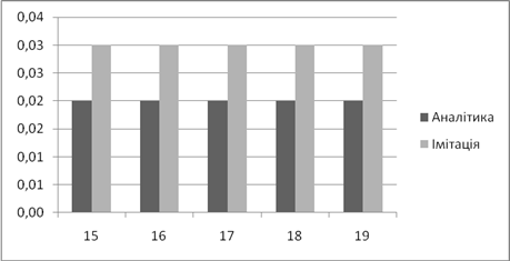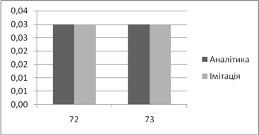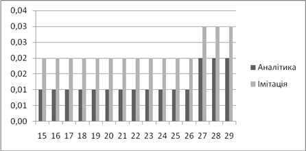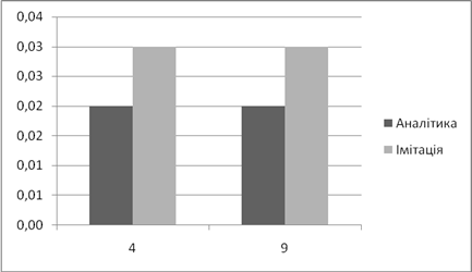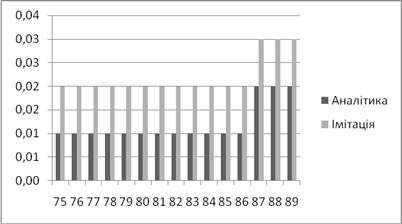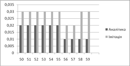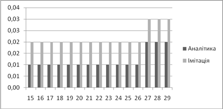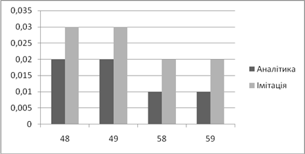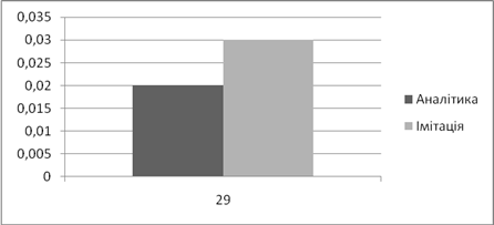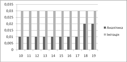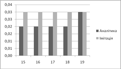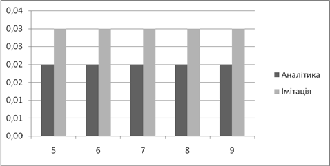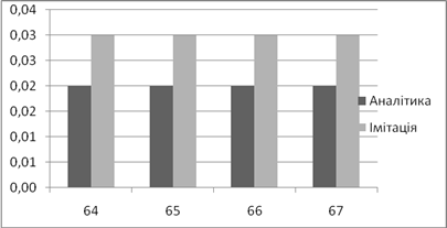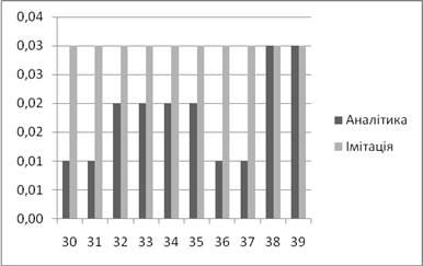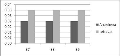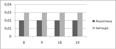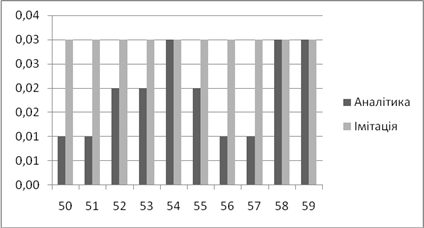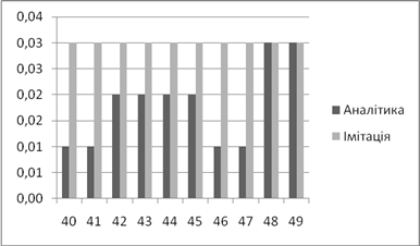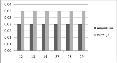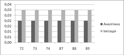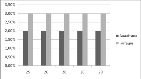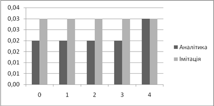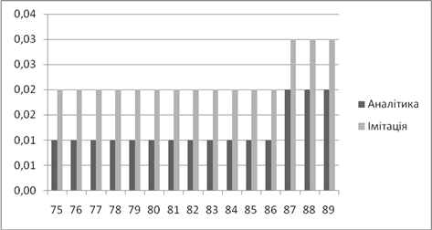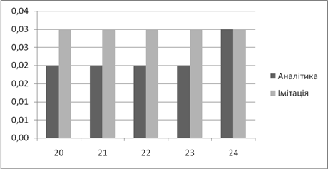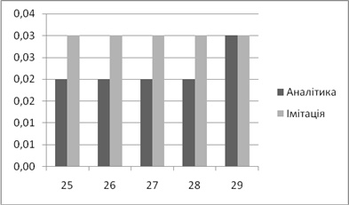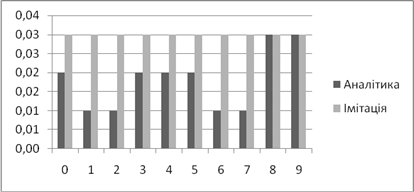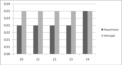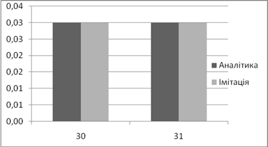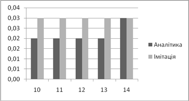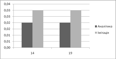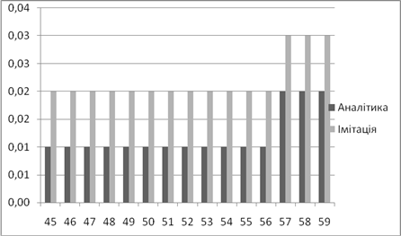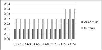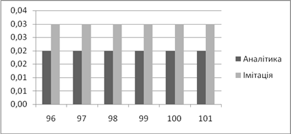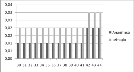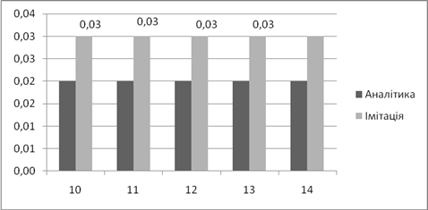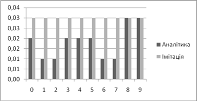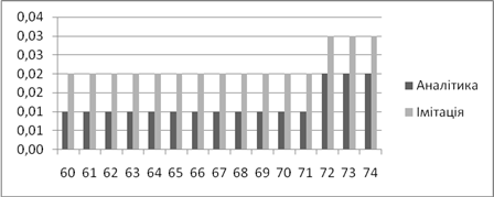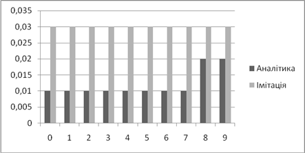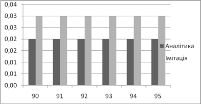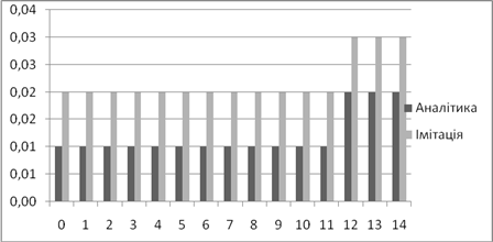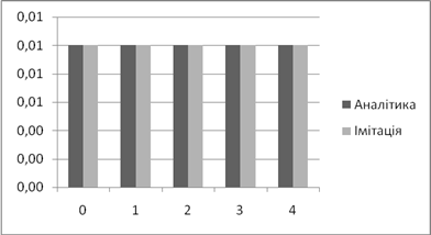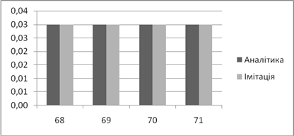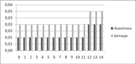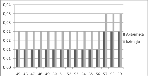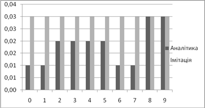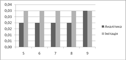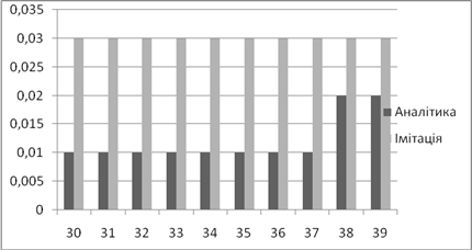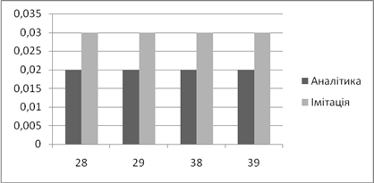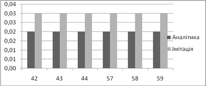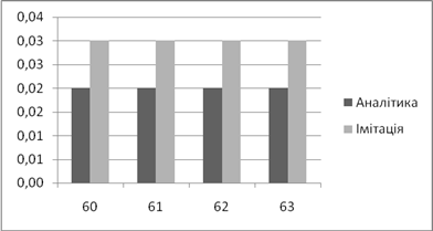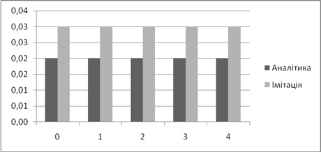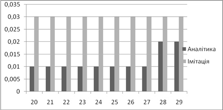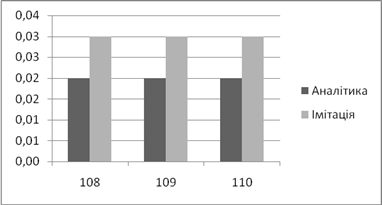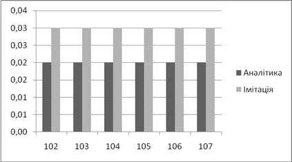 | Аналітичне, *100% | Імітаційне, *100% | Аналітичний, мс | Імітаційний, мс | |