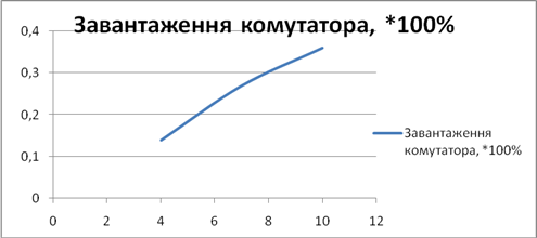 Рис. 66. Залежність завантаженості комутатора КК від кількості абонентів