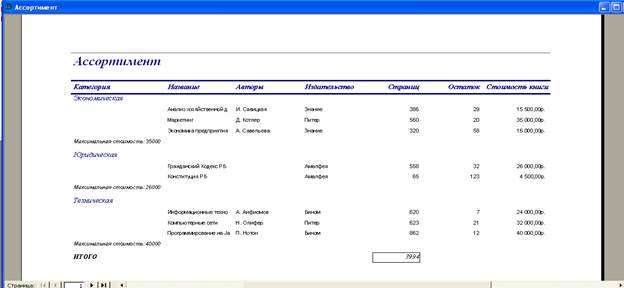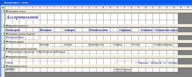 Создание итогового отчета выполнялось при помощи мастера создания отчетов. Для этого в ходе работы мастера создания отчетов были выбраны таблицы «Ассортимент» и «Типы литературы». После этого в отчет была добавлена группировка по типу издания. После создания отчета и его сохранения под именем «Ассортимент» отчет был открыт в режиме конструктора, после чего в отчет было добавлено примечания для группы «КодТипа». В примечание был добавлен элемент управления «текст», в котором было введено выражение ="Максимальная стоимость: " & Max (СтоимостьЕдиницы)