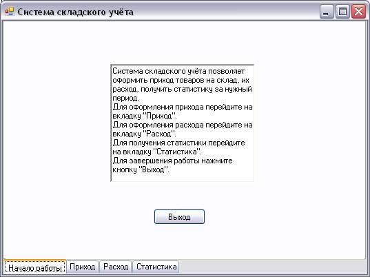 Он служит для получения краткой информации о работе с программой, а также предоставляет возможность завершить работу программы. Сведения о работе с программой предоставляет экран, находящийся в центре формы. Кнопка «Выход» позволяет завершить работу программы.