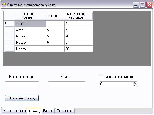 Она служит для ввода информации о товаре в БД «Склад». Для перехода на данную форму необходимо нажать левой кнопкой мыши на закладку “Приход”. Она находится в нижнем левом углу главного окна программы. Здесь мы вводим номер товара на складе, название товара и его количество. Чуть выше находится таблица, в которой отображается информация об имеющихся на складе товарах.
