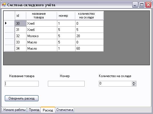 Она служит для ввода информации о товаре, который следует списать на расход. Здесь, также как и на предыдущей форме, вводим номер товара на складе, его название и количество соответственно. При неверно заполненных данных на экран выдаётся сообщение об ошибке. Чуть выше находится таблица, в которой отображается информация о товарах на складе.