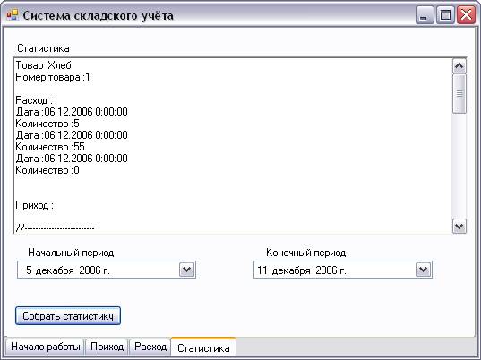 Она предоставляет возможность просмотра статистики за определенный период времени. Пользователь выбирает начальную и конечную даты в полях, находящихся внизу главного окна программы, а затем нажимает кнопку «Собрать статистику». После чего на экране, находящемся чуть выше отображается полная статистика по приходу/расходу товаров за указанный срок.