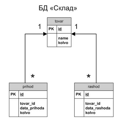 Модель БД представлена в соответствии с рисунком, расположенном ниже. Она описывает отношения между таблицами «tovar», «prihod» и «rashod» составляющими БД «Склад». Таблицу «tovar» и таблицу «prihod» связывает отношение «один ко многим» т.е. одной записи в таблице «tovar» может соответствовать несколько записей в таблице «prihod», связанных по первичному ключу таблицы «tovar» - «id». Таблицу «tovar» и таблицу «rashod» связывает отношение «один ко многим», связанных по первичному ключу таблицы «tovar» - «id». В таблице «tovar» хранится информация о товаре, присутствующем на складе. Таблицы «prihod» и «rashod» хранится информация о поступлении и удалении товара со склада.
