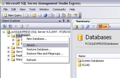 Сначала необходимо скопировать папку «КУРСОВОЙ ПРОЕКТ – СИСТЕМА СКЛАДСКОГО УЧЁТА» на жёсткий диск. В этой папки находится приложение и база данных. Открываем SQL Server Management Studio Express, после чего щёлкаем правой кнопкой мыши по папке Databases. Выбираем в выпадающем меню пункт attach.