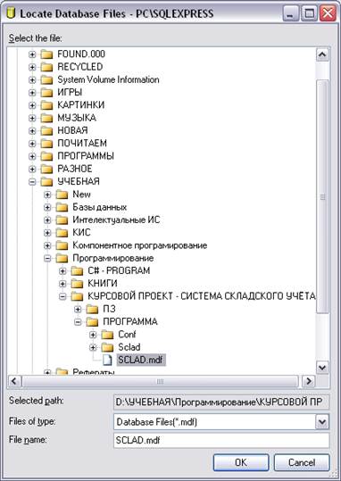 Появляется окно, в котором необходимо выбрать файл Sclad.mdf.