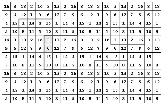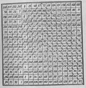 Но есть еще один МК не менее интересный, чем дьявольский. Выдающийся американский масон, ученый, общественный деятель и дипломат Бенджамин Франклин составил квадрат 16×16 (см. рис. 4), который помимо наличия постоянной суммы 2056 во всех строках, столбцах и диагоналях имел еще одно дополнительное свойство. Если вырезать из листа бумаги квадрат 4×4 и уложить этот лист на большой квадрат так, чтобы 16 клеток большего квадрата попали в эту прорезь, то сумма чисел, появившихся в этой прорези, куда бы мы ее не положили, будет одна и та же – 2056.