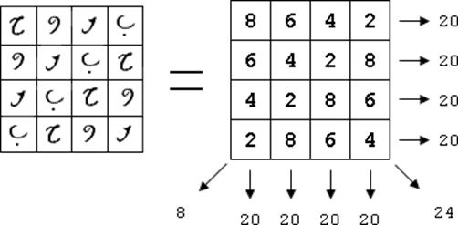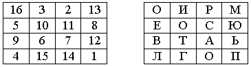 Пример магического квадрата 4х4 и его заполнения сообщением