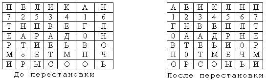 Естественно, отправитель и получатель сообщения должны заранее условиться об общем ключе в виде размера таблицы. Следует заметить, что объединение букв шифртекста в 5-буквенные группы не входит в ключ шифра и осуществляется для удобства записи несмыслового текста. При расшифровании действия выполняют в обратном порядке. Несколько большей стойкостью к раскрытию обладает метод шифрования, называемый одиночной перестановкой по ключу. Этот метод отличается от предыдущего тем, что столбцы таблицы переставляются по ключевому слову, фразе или набору чисел длиной в строку таблицы.