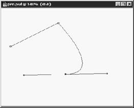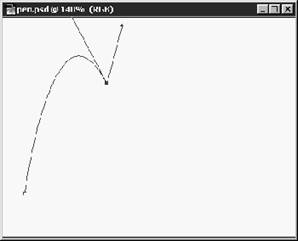 7. Чтобы пояснить сказанное выше более подробно, нарисуйте еще один криволинейный фрагмент. Переместите указатель в центр окна, щелкните кнопкой мыши и перетащите указатель вправо и слегка вниз. Снова будет создан сглаженный узел и криволинейный фрагмент, как показано на рис.12.
