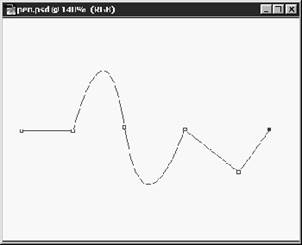 Имеется возможность предварительного просмотра линий контура, которая может оказаться очень полезной в процессе создания всех рассмотренных выше типов узлов и фрагментов. Щелкните дважды на кнопке инструмента Перо (Pen), чтобы вызвать палитру Перо (Pen Tool Options). Единственный параметр здесь - это флажок Предварительный просмотр (Rubber Band). Его установка позволяет видеть как прямолинейные, так и криволинейные фрагменты будущего контура еще до того, как будет выполнен щелчок кнопкой мыши, устанавливающий точку очередного узла. Поэкспериментируйте с данным режимом, чтобы разобраться в том, как он действует.