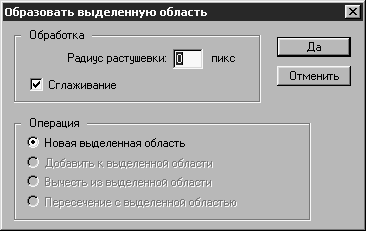 4. В окне диалога Образовать выделенную область (Make Selection), показанном на рис..26, можно задать параметры выделенной области, создаваемой программой Photoshop. При этом чем выше будет значение параметра Радиус растушевки (Feather Radius), тем с меньшей точностью выделенная область будет повторять форму контура