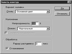 Заливка контура цветом означает именно то, что следует из названия операции. Выделите контур, выберите команду Залить контур (Fill Path) в меню палитры, и перед вами появится показанное на рис.28 окно диалога с тем же набором параметров, какой используется для заливки выделенной области. Здесь можно выбрать для заливки подходящий цвет, образец узора (Pattern) или снимок с экрана (Snapshot). Кроме того, можно выбрать режим наложения пикселей (Blending Mode), задать степень непрозрачности (Opacity), указать, следует ли сохранять прозрачные области (Preserve Transparancy), установить режим сглаживания (Anti-aliased) и определить радиус растушевки границы (Feather Radius).