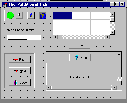 21. Форма "Additional Tab" закончена и готова к тестированию. Сохраните проект и протестируйте его. Должны работать просмотр двух форм и эксперименты с компонентами, которые вы разместили на обеих страницах. Понажимайте на кнопки линейки инструментов и понаблюдайте результаты. С помощью линейки прокрутки вы должны увидеть кнопку Help и панель. Щелкните на кнопке Help в панели с прокруткой и убедитесь, что появляется окно с сообщением. Когда все закончено, нажмите Close, и программа завершится.