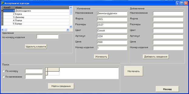 Рисунок 3. - Форма «Ассортимент одежды». Поиск.