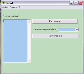 Первая форма (mainForm) должна отражать дружественный интерфейс, вариационный ряд чисел, количество этих чисел, оценку центра, количество столбцов и две кнопки. Button1 будет называться «Гистограмма», Button2 – «Рассчитать».