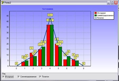 При нажатии кнопки Button1 открывается вторая форма (grafic), которая отображает графики (гистограмма исходных данных, симметрированная гистограмма и полигон). Для удобства внизу формы расположены флажки (CheckBox1, CheckBox2, CheckBox3), а они в свою очередь на панели (компонент GroupBox1). Эти флажки можно как включать так и отключать. По умолчанию, при открытии формы, они активированы.