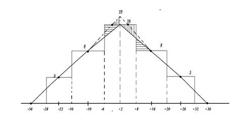 Целью данной работы являлась разработка программы на языке программирования Delphi для идентификации формы закона распределения погрешностей экспериментальных данных. Построение полигона, который более наглядно, чем гистограмма, отражает форму распределения, производилось путем соединения прямыми середин верхних оснований каждого столбца гистограммы. За пределами гистограммы, как слева, так и справа следовали пустые интервалы, в которых точки, соответствующие их серединам, лежали на оси абсцисс. Все эти точки, при построении полигона, соединялись между собой отрезками прямых линий, образуя с осью х замкнутую фигуру. При замене гистограммы кривой в виде полигона выполняется автоматически правило нормирования, т.к. от каждого большого столбца гистограммы (рис.1) отсекается и отбрасывается часть площади в виде треугольников, заштрихованных на рис.1 вертикально, а к каждому меньшему столбцу добавляются такие же площади треугольников, заштрихованных горизонтально. В итого общая площадь под кривой полигона остается равной площади исходной гистограммы. Однако это «перемещение площадей» при переходе от гистограммы к полигону происходит всегда «вниз по склону». В итоге площадь центрального столбца в полигоне оказывается меньше площади центрального столбца гистограммы. Чтобы устранить это явление, мы считали центральный столбец гистограммы состоящим из двух равных столбцов. В этом случае вершина кривой полигона выше верхнего основания центрального столбца, как это показано штриховой линией на рис.1, но площадь под кривой полигона в пределах центрального столбца будет равна площади центрального столбца гистограммы.