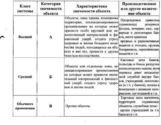 Классификация ТСВ по категории значимости объекта приведена в таблице 1.