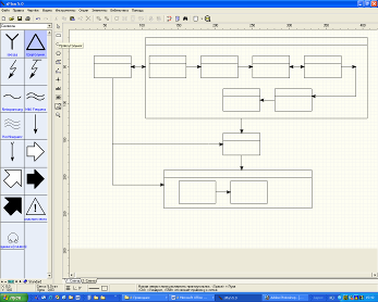 Первым этапом установили размер сетки равный 1 мм и привязку к ней. Используя опцию Прямоугольник , на панели инструментов, строим предполагаемое количество блоков и соединяем их стрелками из библиотеки Символы и линиями опции Линия . Рис.2.3