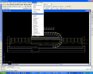 AutoCAD 2004 имеет набор примитивов с помощью которых быстро и удобно чертить. Примитивы расположены в левой части окна или во вложенном меню Рисование. Начиная работу удобно выбираем рабочую область Формат/ Лимиты рисования , задаем в командной строке координату по X и поY , сетку GRID (внизу экрана), а и привязку к сетке SNAP . Вверху экрана в соответствующем окне необходимо установить форму и толщину линий. Удобно при черчении использовать разные слои, например, разделить слои со вспомогательными линиями, основной чертеж и размеры. Можно чертить используя примитивы на панели инструментов, но в данном случае необходимы точные размеры, поэтому чертится, используя меню Рисование , откуда выбирается необходимый элемент. Сначала чертим вспомогательную осевую линию, чтобы она явно отличалась, выбираем желтый цвет и соответствующую форму линии из выпадающего меню. Поскольку необходимой линии нет в стандартной установке, ее следует добавить Other/Загрузить/ Center. Чертим прямоугольник используя меню Рисование /Прямоугольник , в командной строке задаем начальную точку (X,Y) и конечную точку (X,Y). Поскольку устройство имеет большое количество одинаковых блоков достаточно начертить один комплекс а затем растиражировать их используя команду Копировать в буфер обмена и Вставить из буфера обмена вверху экрана на панели инструментов.