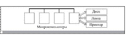 Не будешь же каждый раз после включения питания заново набирать выполняемую программу или хранить ее в маловместительной постоянной памяти. На помощь снова пришли средства связи. Объединив несколько микрокомпьютеров, можно было организовать совместное использование ими компьютерной периферии (магнитных дисков, магнитной ленты, принтеров). При этом вся обработка информации проводилась на месте, но ее результаты передавались на централизованные ресурсы. Здесь опять же совместно использовалось самое дорогое, что есть в системе, но уже совершенно по-новому. Такой режим получил название режима обратного разделения времени (рис. 1.2). Как и в первом случае, средства связи снижали стоимость компьютерной системы в целом.