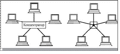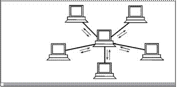 (star) — к одному центральному компьютеру присоединяются остальные периферийные компьютеры, причем каждый из них использует отдельную линию связи
