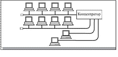 Звезда, показанная на рис. 1.6, носит название активной или истинной звезды. Существует также топология , называемая пассивной звездой, которая только внешне похожа на звезду (рис. 1.11). В настоящее время она распространена гораздо более широко, чем активная звезда. Достаточно сказать, что она используется в наиболее популярной сегодня сети Ethernet.