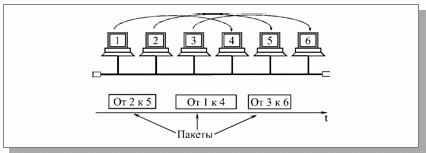 . Информация от каждого компьютера одновременно передается всем остальным компьютерам (рис.