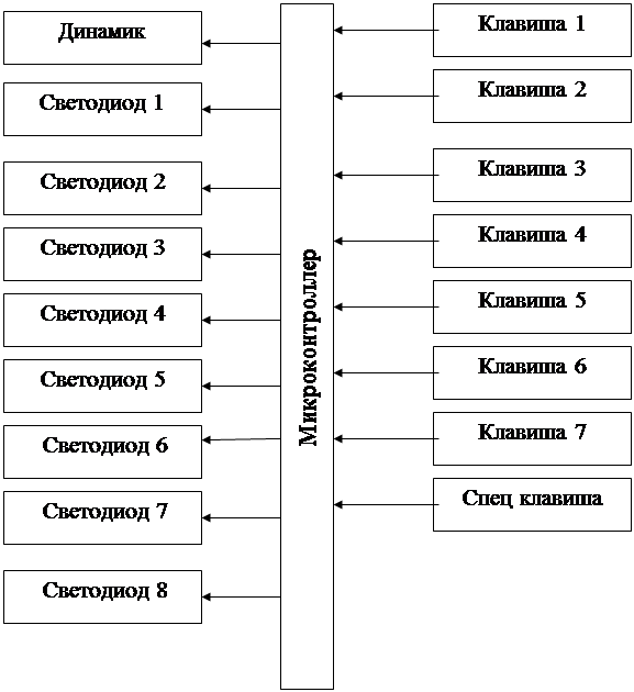 Цель работы: разработка микропроцессорной системы на базе микроконтроллера, синтезатора игры на пианино в пределах одной октавы, обеспечивающий проигрывание мелодии из памяти и проигрывания нот при нажатии клавиш, индикацию состояния нажатия клавиш при помощи светодиодов. Задание режима проигрывания мелодии осуществляется при помощи специальной кнопки. Проигрывание мелодии отображается специальным светодиодом.
