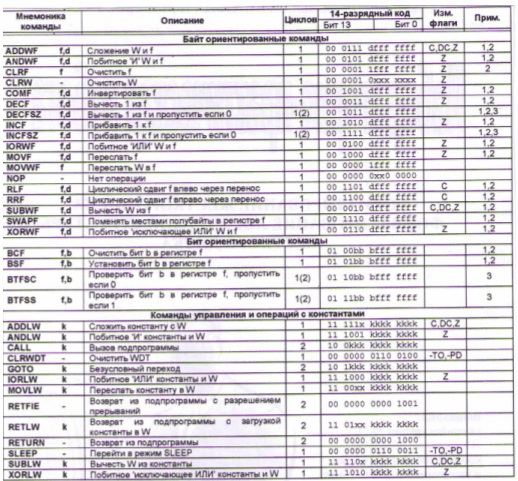 Микроконтроллеры семейства РIC имеют очень эффективную систему команд, состоящую всего из 35 инструкций.