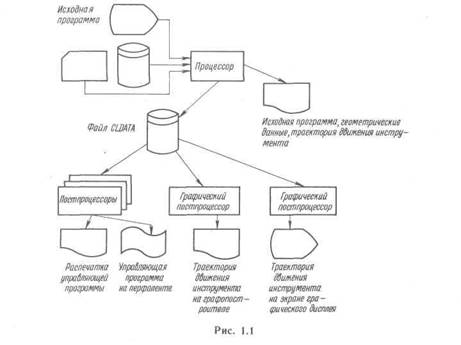 Структура САП приведена на рис. 1.1. Обычно в состав САП входит библиотека постпроцессоров, каждый из которой предназначен для определенной модели системы ЧПУ или модели станка. Разрабатываются также универсальные постпроцессоры, способные формировать УП для различных систем ЧПУ. Графические постпроцессоры предназначены для вывода траектории движения Инструмента на графические отображающие устройства.
