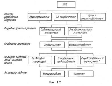 состоит в том, является автоматизация технологических задач свойством, заложенным в концепцию САП при ее разработке, или такая автоматизация реализована на основе библиотеки типовых технологических процедур. В большинстве САП (например, САП-CM, APT, FAPT, IFAPT, MODAPT) автоматизация технологических задач решается при помощи технологических процедур. Среди САП со встроенной автоматизацией технологических задач можно назвать ЕСПС-ТАУ, Техтран-Т, Autotech, ЕХАРТ (ФРГ), FANUC-3T и MAZATROL (Япония).