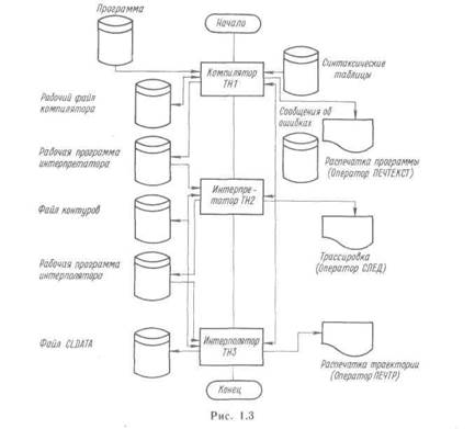 осуществляет ввод и трансляцию исходной программы на входном языке системы, выполняет заданные геометрические построения и рассчитывает траекторию движения центра инструмента. Результаты расчета выводятся в файл CLDATA. Структура процессора системы Техтран приведена на рис. 1.3. Процессор организован в виде трех последовательно выполняемых модулей: компилятора, интерпретатора и интерполятора. Каждый модуль может рассматриваться как законченная программа. Обмен данными между модулями производится только через промежуточные файлы на диске.