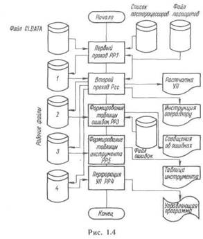 выполняет синтаксический контроль операторов постпроцессора, учитывает динамические особенности оборудования, формирует на диске образ управляющей программы и другие рабочие файлы, распечатывает управляющую программу и инструкцию оператору станка. Постпроцессор формирует три рабочих файла, каждый из которых обрабатывается специальной программой: